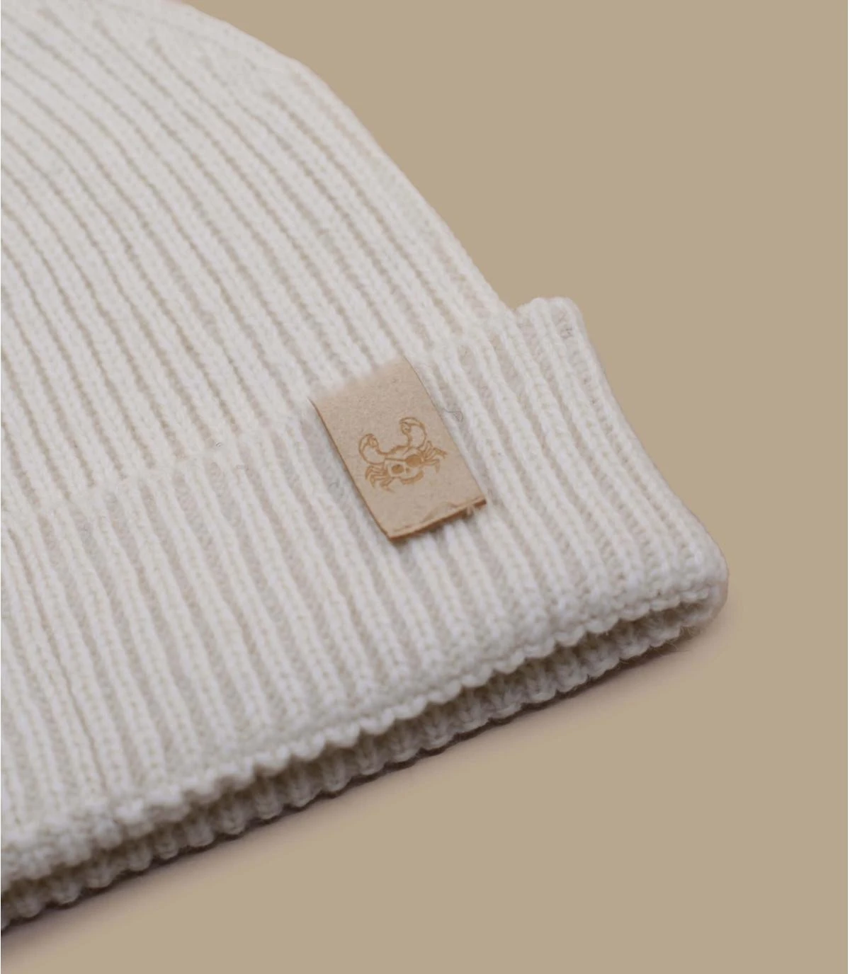 Bonnet en laine fabriqué en France dans la région Rhone Alpes et personnalisé dans notre Atelier d’Annecy, à partir de matières recyclées. Crabe pirate gravé sur patch beige.
