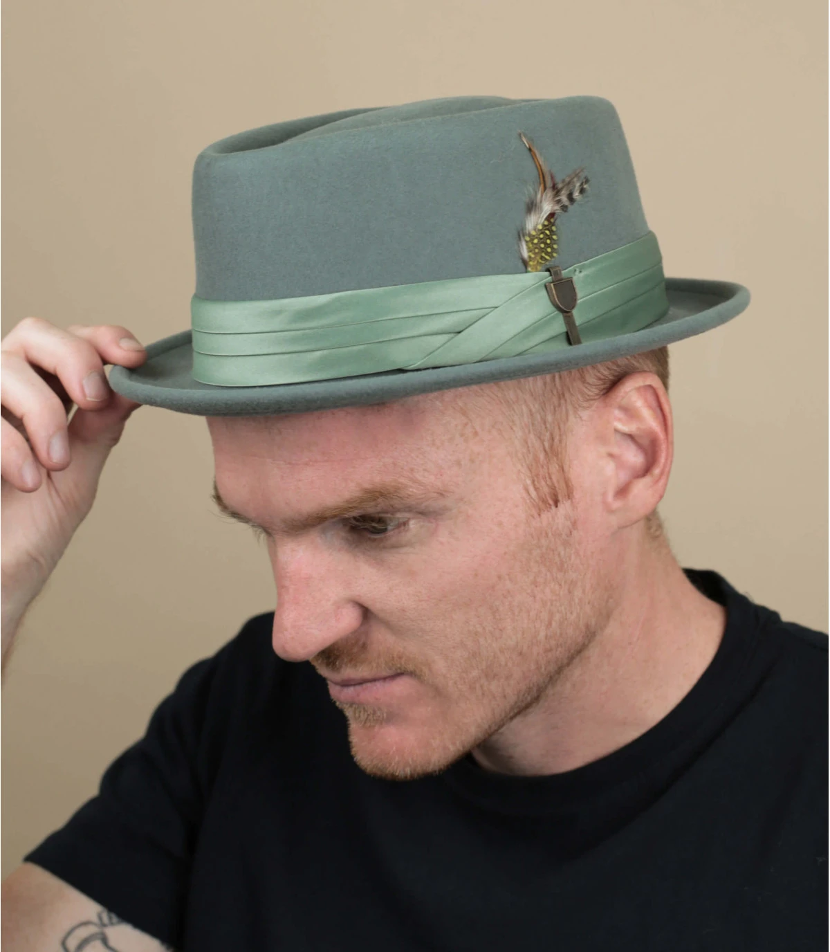 Ce chapeau pork pie vous donnera une classe inimitable grâce à son coloris vert, et son allure jazzy qui date des années 30. Une plume a été ajoutée sur un bandeau de même couleur pour un maximum d’effet.