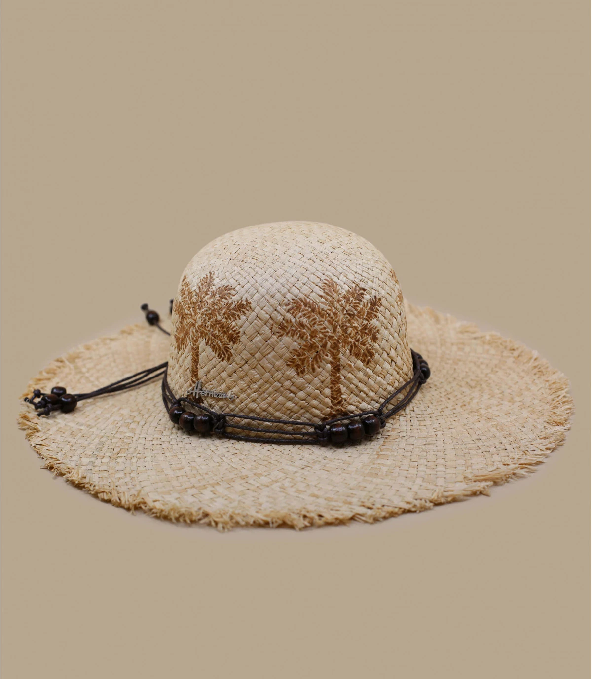 Optez pour un chapeau en paille d’apparence naturelle avec ce modèle 100 % raphia beige. Ses rebords larges sont effilés pour un effet sauvage. Il est décoré de palmiers sur la couronne. Une lanière de cuir avec des perles entoure la crête.