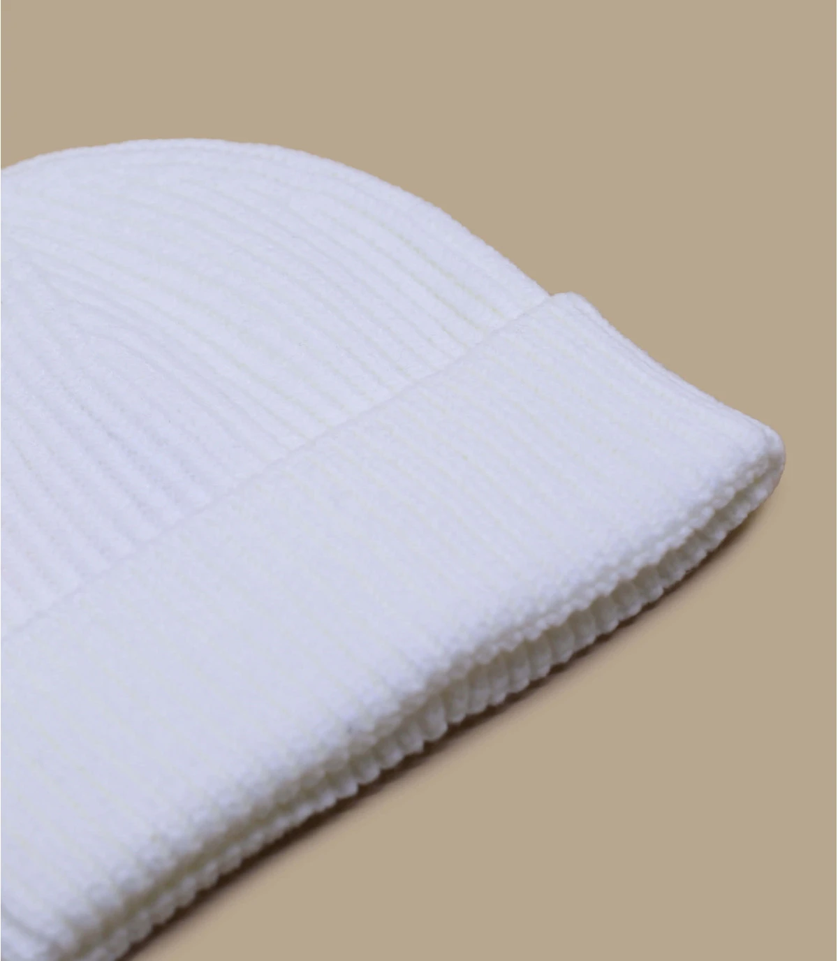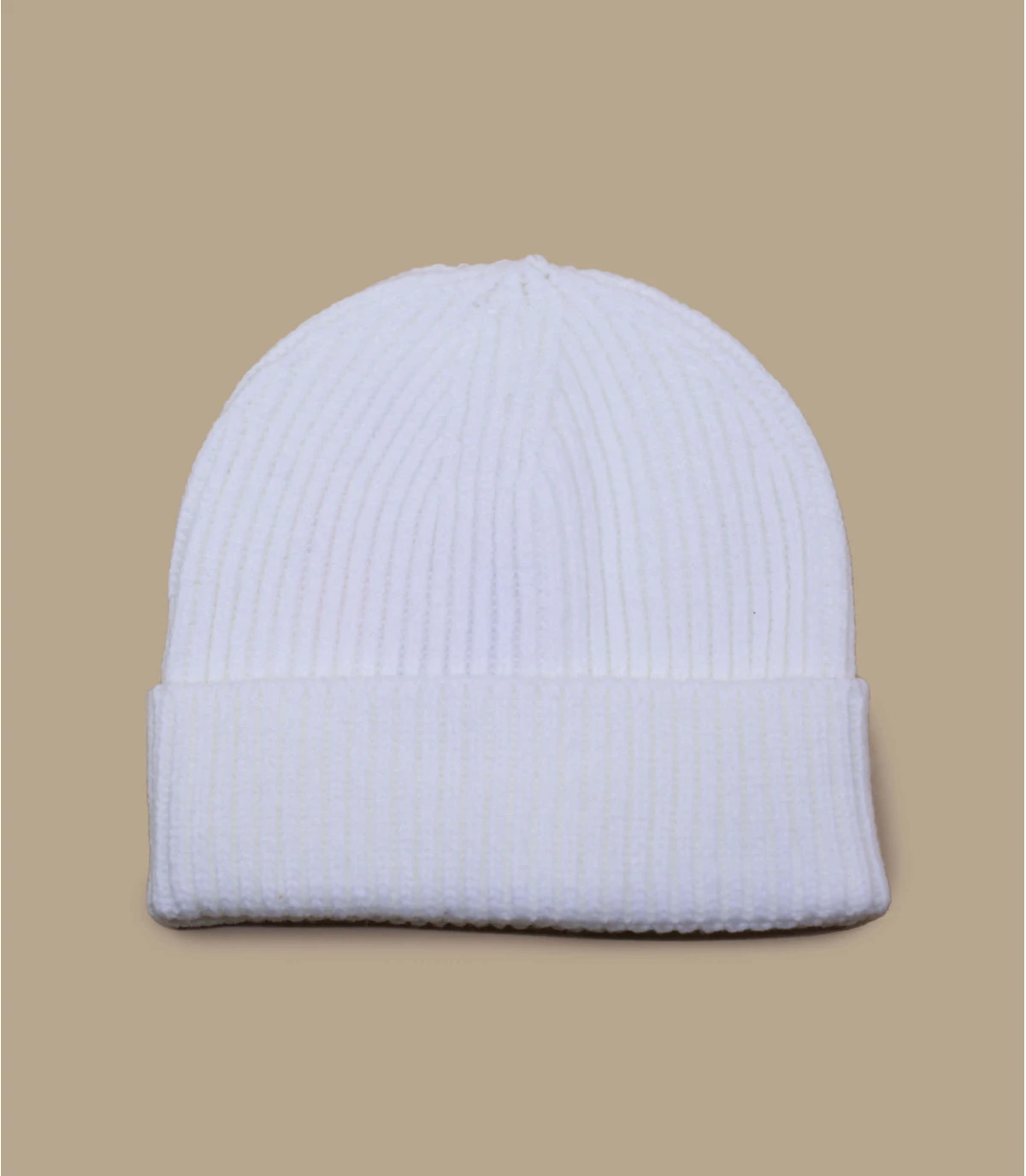 Bonnet revers en maille acrylique de couleur blanc. Taille unique : 55-60 cm de tour de tête.