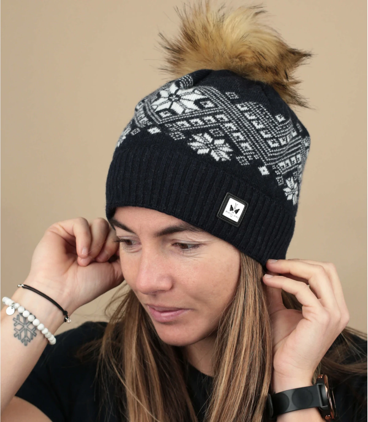 Un bonnet à la fois écolo et élégant, c’est plutôt rare ! Ce bonnet à pompon pour femme bleu marine est fabriqué en Italie à partir de matières recyclées. Il porte un motif chaleureux qui rappelle les soirées au coin du feu.