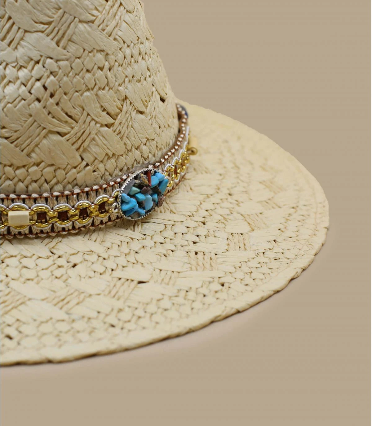 Le tressage original de ce ravissant chapeau de paille pour femme compose un motif à rayures, il est relevé d’un ruban de perles noué au dos qui lui donne une allure très féminine. C’est un modèle idéal pour se protéger du soleil au bord de l’eau et accompagner une jupe longue ou un jean.