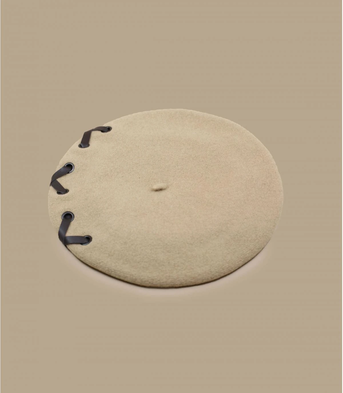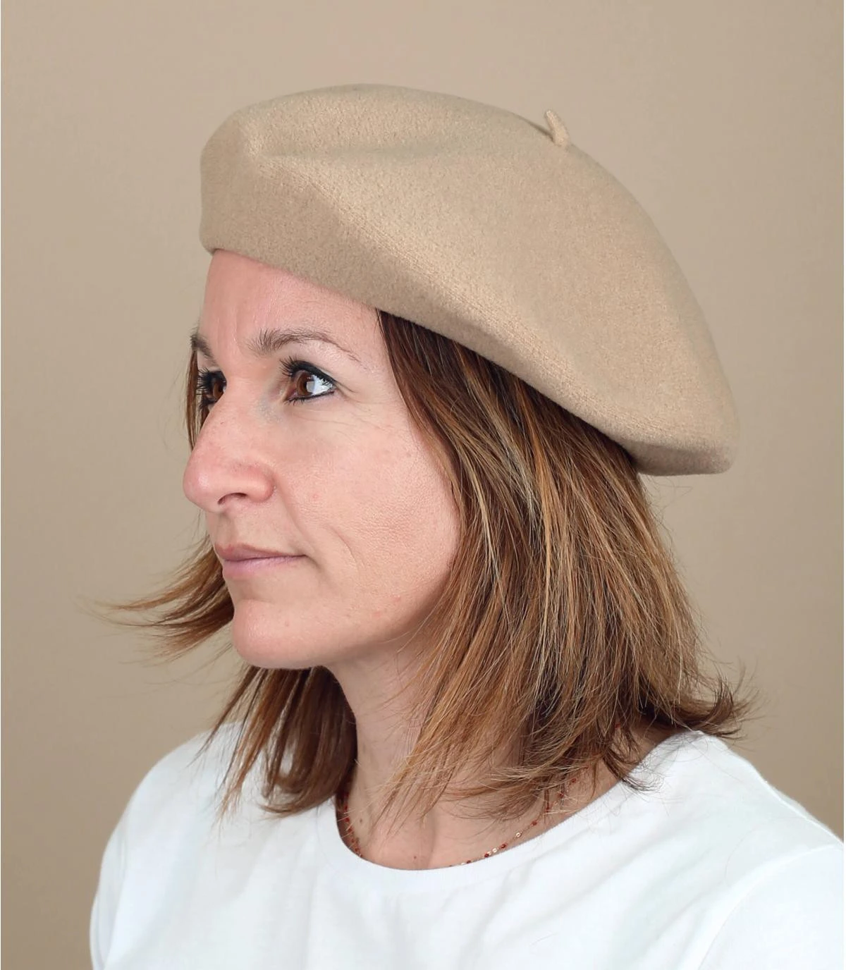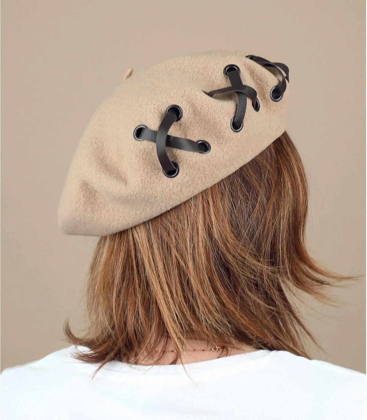 Cet adorable béret beige confectionné à la main en pure laine mérinos dans les Pyrénées française est relevé d’un charmant cordon de cuir croisé sur les côtés qui lui donne une touche féminine piquante. Il s’assortira facilement au reste de vos accessoires.