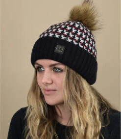 De style légèrement rétro, ce bonnet à pompon bleu marine pour femme, idéal pour le ski, arbore un motif à carreaux rouge et bleu et un joli pompon. Sa fabrication est écologique à partir de fibres recyclées en Italie.
