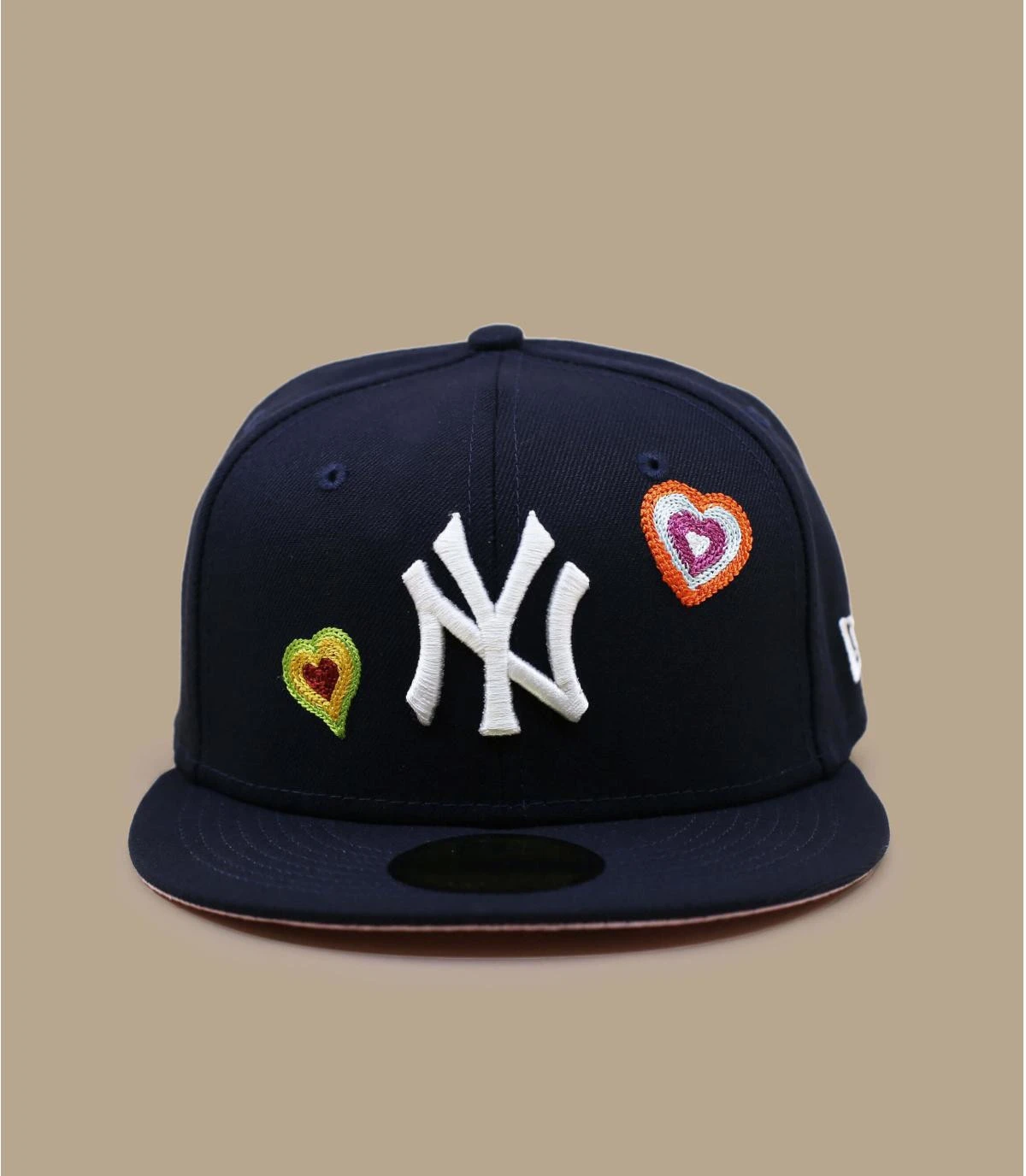 Il y a beaucoup d’amour sur cette casquette bleu marine ! Elle porte des cœurs brodés en couleur à l’avant et à l’arrière, et sur le côté avec les célèbres initiales New York brodées en blanc. Le dessous de la visière est rose.