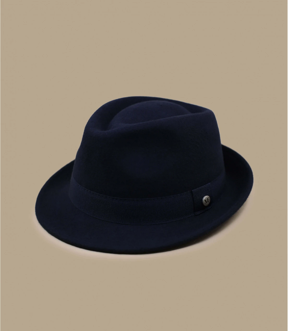 Couvrez-vous avec style cet hiver, en portant ce superbe chapeau trilby en feutre de laine déperlant de couleur bleu marine. Relevé d’un galon ton sur ton et d’un petit pin’s en métal, il est souple et doux, sa confection soignée est réalisée en Italie.