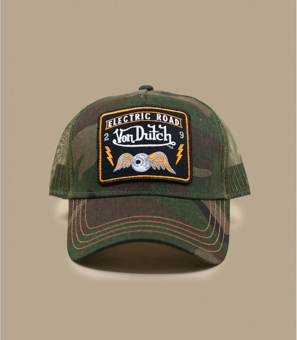 Superbe trucker Von Dutch USA à l’imprimé camo très tendance. Le patch noir est brodé en blanc et orange du fameux Flying Eyeball, la signature de l’immense artiste Kenneth Howard, héros de la contre-culture américaine dans les années 50.